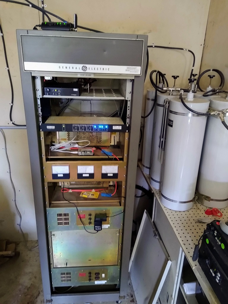| Here is a closeup of the repeater. On top of the cabinet is a Cradlepoint 1200B Mifi device that provides the site with internet access using 4G cellular. On the first shelf is the Motorola M120 link transceiver, used to link to HUB1 or HUB2 The next position down is the SCOM 7330 controller and below that is the Raspberry Pi - this has a serial connection to the controller. Below all this is the GE Mastr II equipment. To the right of the rack, you can see the 2m duplexer. |